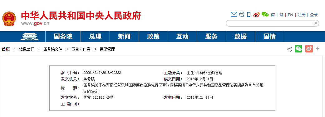 近日,國務院發布《關于在海南博鰲樂城國際醫療旅游先行區暫時調整實施<中華人民共和國藥品管理法實施條例>有關規定的決定》。國務院決定,在海南博鰲樂城國際醫療旅游先行區暫時調整實施《中華人民共和國藥品管理法實施條例》第三十六條的規定,對先行…