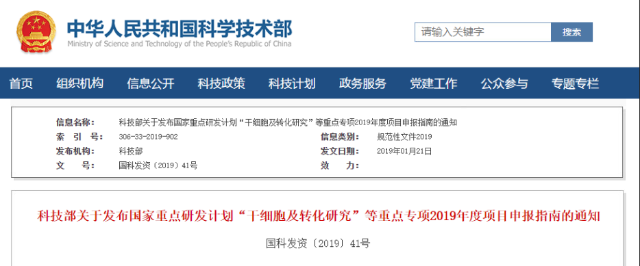 2019年1月21日,我國科技部官網正式發布了“干細胞及轉化研究”重點專項2019年度項目申報指南,指南中明確:在之前已支持98個項目的基礎上,2019年國家再撥款4億元,支持12個干細胞研究方向。其中干細胞資源庫、干細胞治療性腺衰老也寫入申報指南。指南中明確…